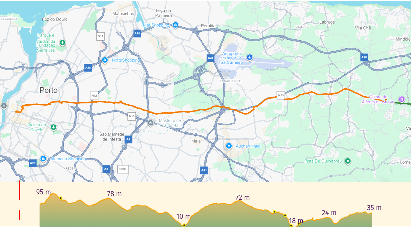 Cruzamos al Ponte de Moreira, sobre el río Leça. Pasado éste, cruzamos la autopista A41 por un paso superior (ATENCIÓN: cruzar la avenida por el paso de peatones que está a la mano izquierda del paso superior), tomamos a la derecha la avenida del aeropuerto hasta una gran rotonda y, en la misma dirección, avanzamos otros 400 metros por la N13. Alcanzamos Moreira de Maia, a la altura del Cementerio de Moreira.