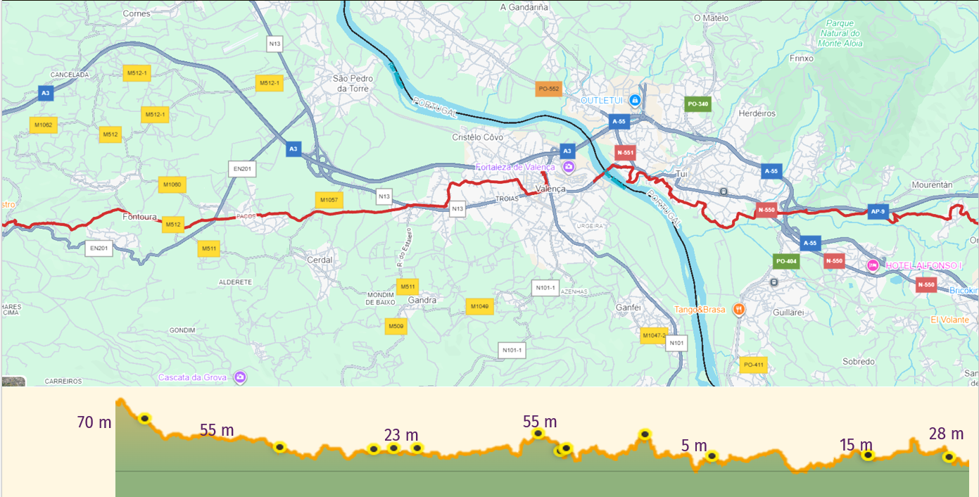 Desde la rotonda seguimos de frente la avenida de España. Entrada al puente internacional (1886) sobre el N13. Lo cruzamos por su pasarela peatonal, entrando así en España. A la salida del puente nos desviamos a la derecha hacia el paseo del Miño, desde el cual iniciamos la subida al casco antiguo de Tui por la calle Obispo Maceira. A la altura de la nacional, por la derecha, tomamos las calles Piñeira y Sanz; al final de esta última giramos a la derecha para acceder a la plaza del Concello, en la que se encuentra la catedral. Os aconsejamos visitar la Catedral de Tui y tomar una pausa por aquí.