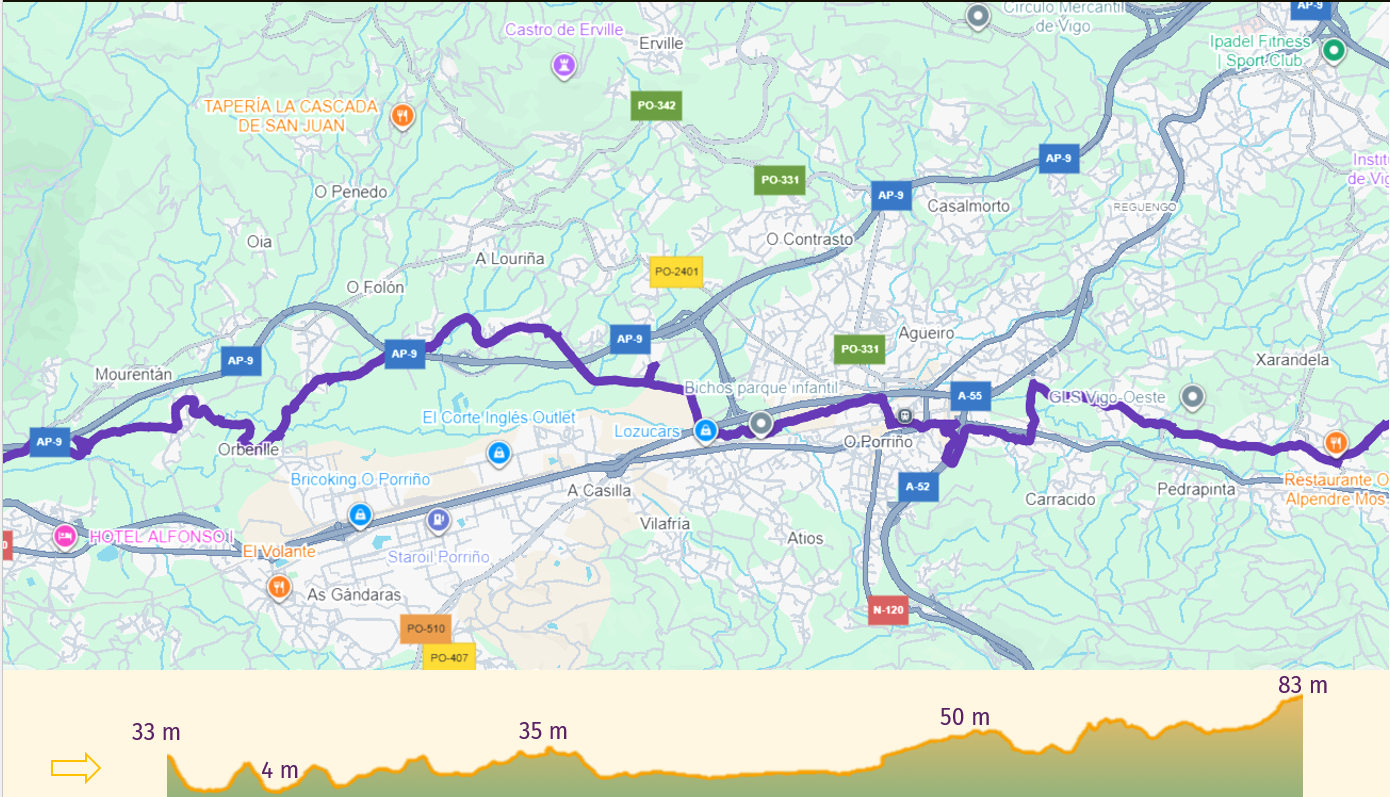 Cruzamos por una aparatosa plataforma metálica la vía del tren y salimos a la N-550, justo debajo de la A-55. Seguimos dicha nacional (hay bares); más adelante, ya en el núcleo urbano de O Porriño, la nacional pasa a ser la avenida Domingo Bueno.