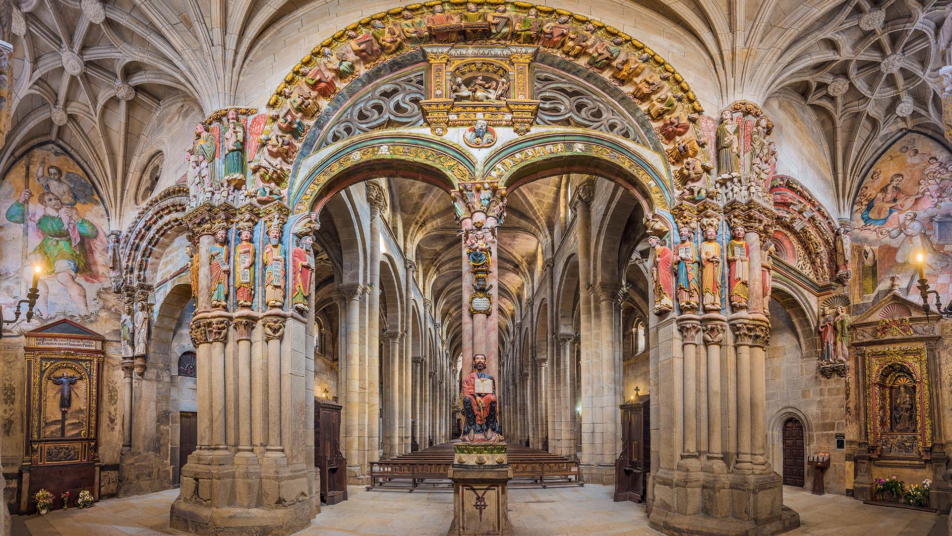 Recorrido: Salimos de Santiago de Compostela hacia Ourense, donde podremos admirar As Burgas, una fuente de aguas termales en el centro de la ciudad, y la Catedral de Ourense, con su joya: el Pórtico del Paraíso, influenciado por el Pórtico de la Gloria. Luego visitamos la emblemática Iglesia de San Vicente de Pombeiro (a confirmar) y hacemos una pausa para almorzar en la hermosa Playa Fluvial de A Cova. Después de descansar, seguimos hacia el Mirador de Cabo do Mundo, con una de las vistas más espectaculares de la Ribeira. Dependiendo del día, es posible organizar un paseo en barco de 2 horas por el río Miño (esto implicaría cambios en el itinerario).